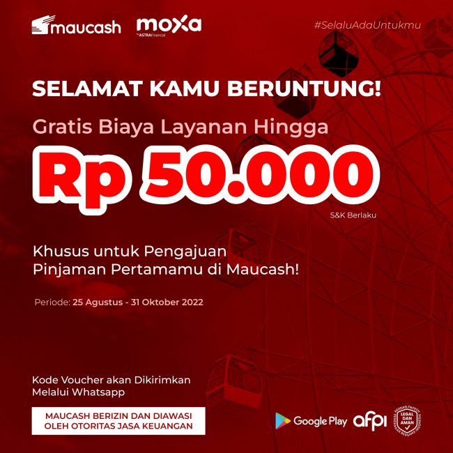 Selamat! Khusus kamu pengguna moxa yang beruntung mendapatkan GRATIS BIAYA LAYANAN MAUCASH hingga Rp 50.000 untuk pengajuan pinjaman pertamamu di Maucash sekarang juga! Cara pakai voucher promo: Download aplikasi maucash di Play Store atau klik tombol “Ajukan Pinjaman” dibawah ini Daftar, isi dan lengkapi form online sesuai dengan petunjuk (isi dengan data yang sesuai dan…